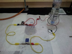 En esta imagen se muestra el montaje casero realizado para la celda electrolítica de producción de hipoclorito sódico a partir de cloruro sódico, NaCl.