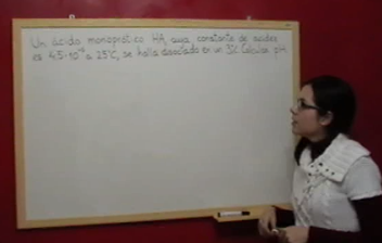 En este ejercicio calcularemos el pH de una disolución de un ácido débil monoprótico HA, sabiendo su constante de acidez, Ka, y su grado de disociación, alfa.